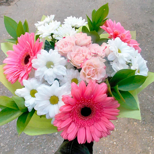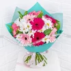 (на фото) гербера розовая - 3 шт, хризантема кустовая ромашковая - 3 шт, роза кустовая розовая - 1 шт, рускус, упаковка, лента. Примерный диаметр букета 30х30 см.