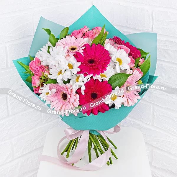 Вся прелесть букета заключена в изящных герберах, пышных розах и нежных, девичьих хризантемах. Букет станет изысканным знаком внимания молодой девушке. Он поможет выразить светлые, зарождающиеся чувства. Белый цвет говорит: “ты мне нравишься”, а розовый добавляет: “очень”. Заказав у нас эту романтическую композицию, вы сможете в прямом смысле изменить судьбу, ведь цветы, как известно, топят даже самые холодные и неприступные сердца.