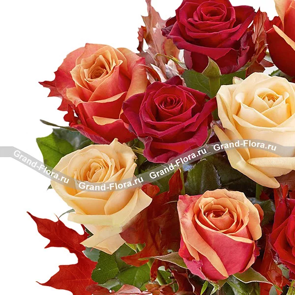 17 роз: роза красная - 7 шт.(70см), роза оранжевая - 5 шт.(70см), роза кремовая - 5 шт.(70см), Декор - осенние листья/ или упаковка.