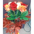 21 роза: роза красная - 8 шт.(70см), роза оранжевая - 7 шт.(70см), роза кремовая - 6 шт.(70см), Декор - осенние листья.