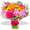 Хризантема ромашковая фиолетовая - 9 шт., гербера оранжевая - 5 шт., гербера желтая - 4 шт., роза розовая - 6 шт., роза оранжевая - 5 шт., альстромерия оранжевая - 6 шт., альстромерия розовая - 6 шт., хризантема одноголовая зеленая - 6 шт., лист рабелини - 5 шт., натуральная упаковка розовая, бант в тон.