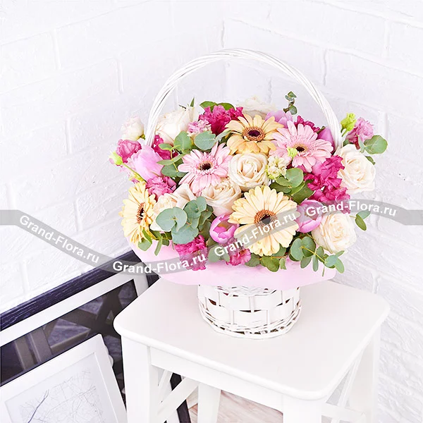 Уменьшенный: роза белая - 4 шт., гербера розовая - 1 шт., гербера желтая - 2 шт., тюльпан розовый - 4 шт., эустома розовая - 4 шт., эвкалипт, оазис, корзина. Примерный размер: 20Х20 см.
