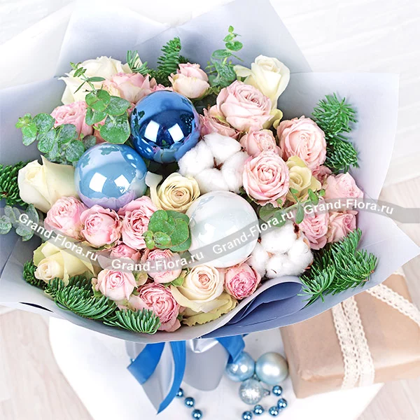 Для завершения образа в букет включены ёлочные игрушки – небольшие шары и фигурки, выполненные в серебристых и золотистых тонах. Они добавляют блеска и сияния, подчёркивая торжественность момента.